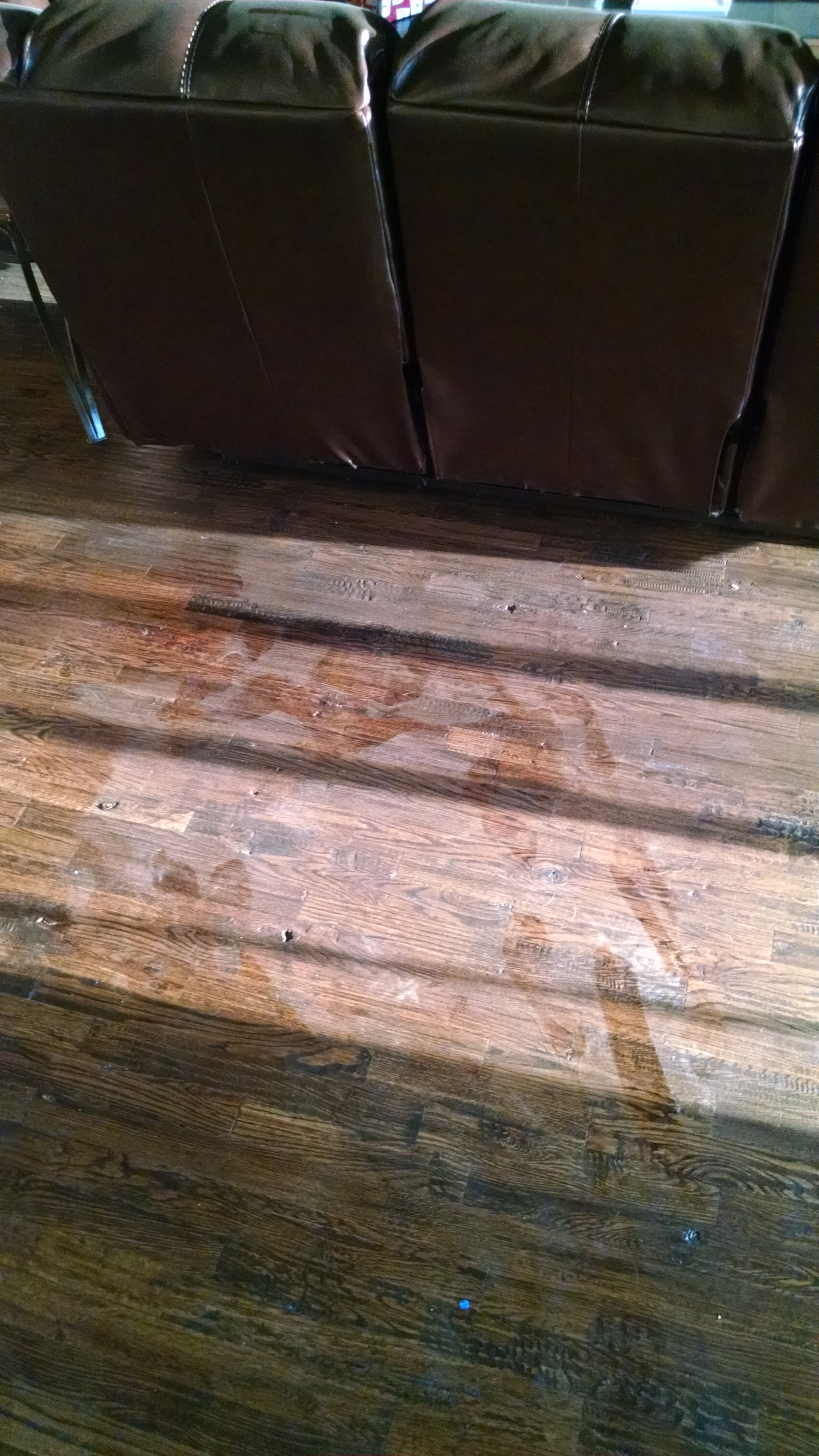 Oct. 28 we ran the dishwasher and later that evening we noticed a pool of water next to it on the hardwood floor. The hardwood ended up being warped and the plumbers and appliance repair people blamed each other but ultimately it was fixed somewhat timely. The hardwood was another story. They didn’t replace the damaged wood until this last Saturday Dec 13. And of course neither Maverick Homes or the hardwood floor company had anyone clean up afterwards. So we got to do our 2nd massive cleanup since moving in. I took a picture of it to show what our floors looked like the day we closed (since I didn’t back then) and then again after the hardwood floor repair. This is what all the kitchen cabinets, light fixtures, dining room table and chairs, etc looked like.