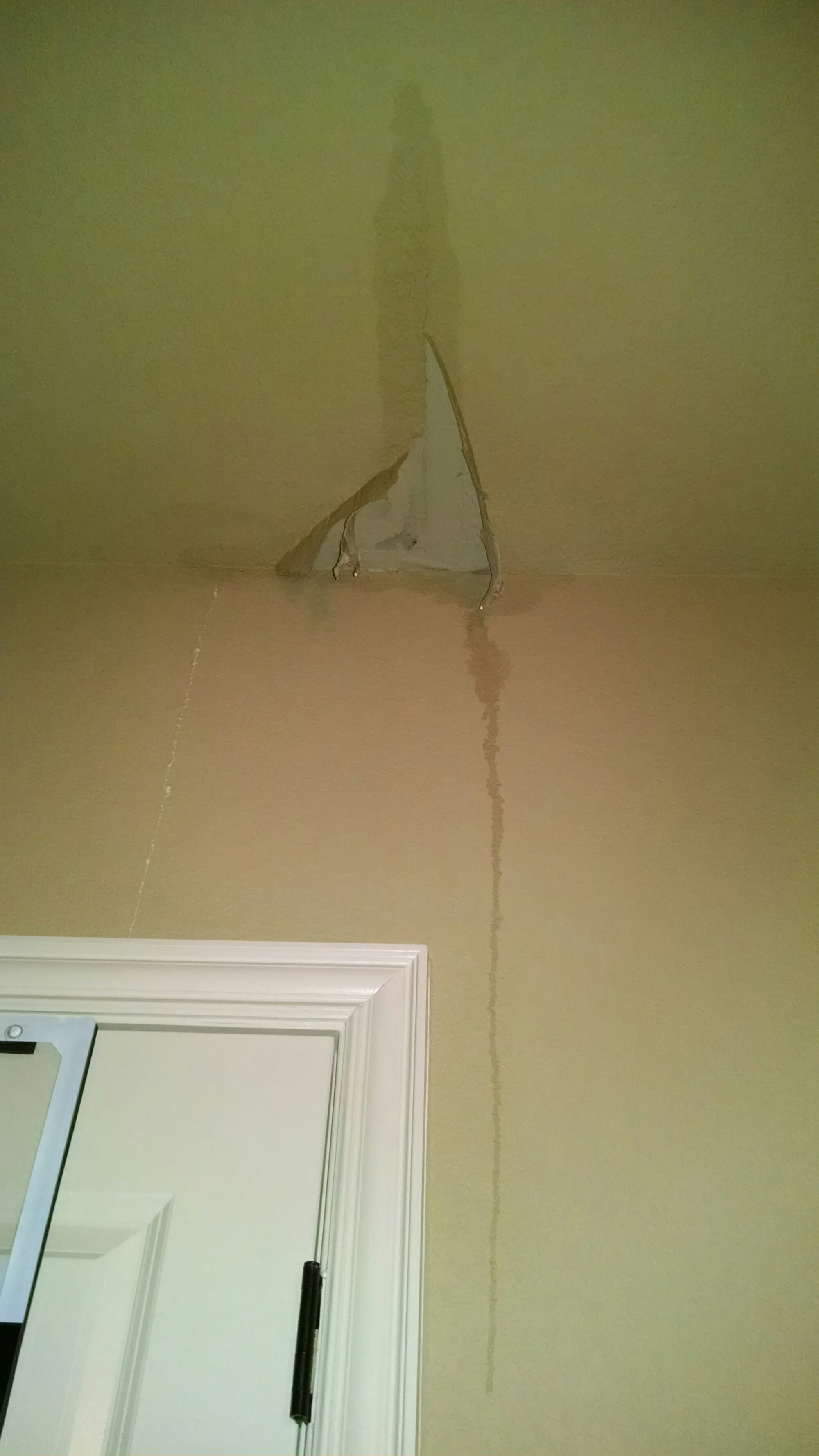 Here’s a picture of where the water was coming through the ceiling. We still have 2 tubs in the attic to catch the water every time we get rain as they haven’t fixed the leak.