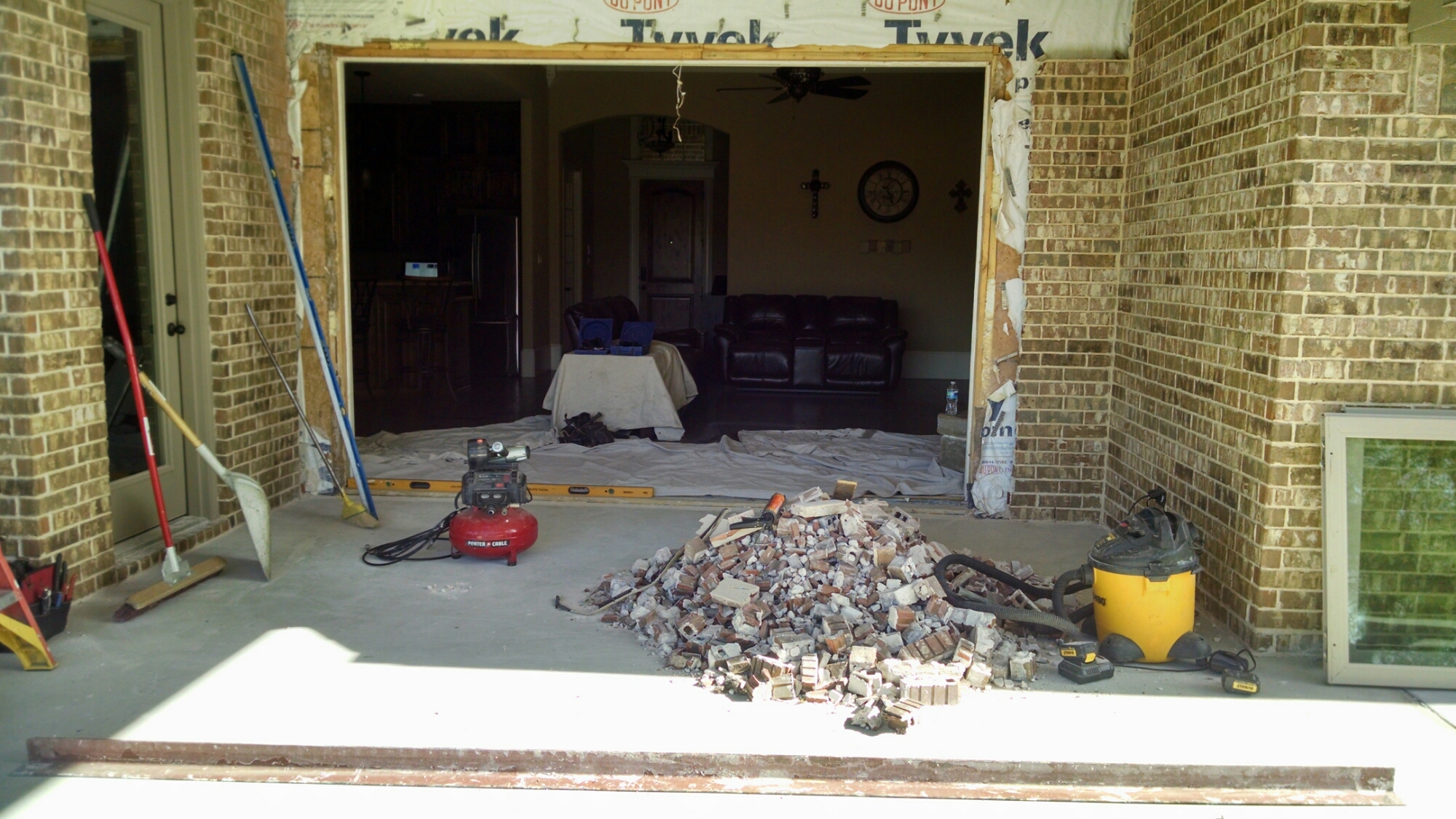 Notice there is nothing covering our patio concrete where they threw the old bricks. Patio door has finally been installed correctly but they beat the crap out of our concrete by just letting the brick drop on it when they were removing it. Then they made even more pits when they threw them into the pile as shown.