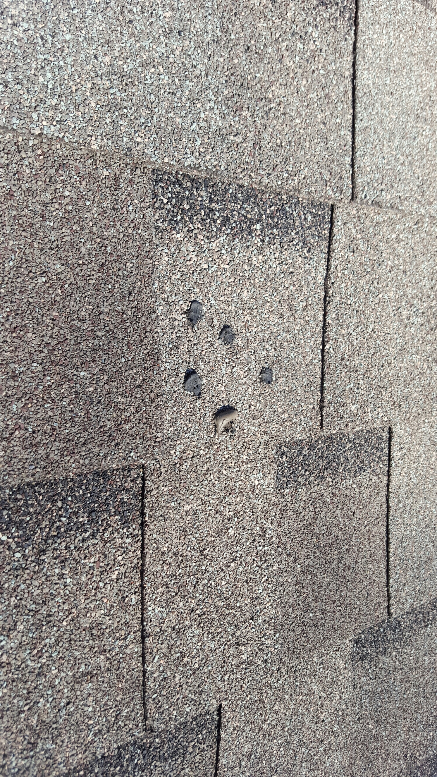 Hmmm, found even more nail holes in our shingles, this time on the front side of the house.